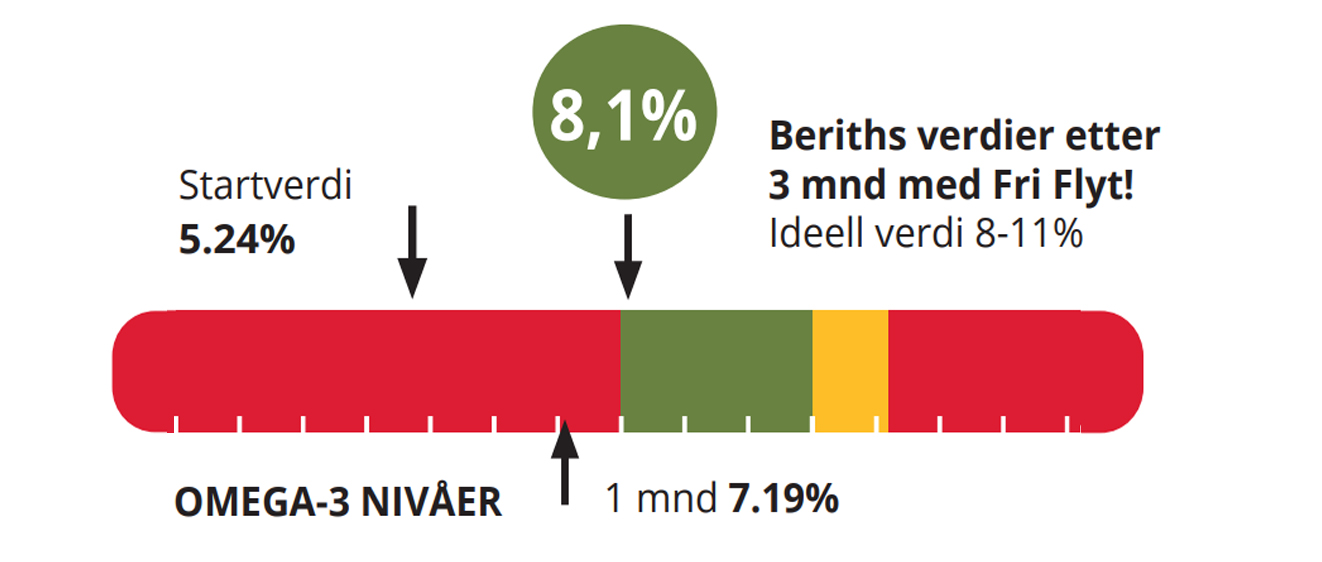 Etter ytterligere to måneder lå Beriths verdier på 8,1%, som er innenfor de ideelle nivåene. På bare 3 måneder hadde altså Berith oppnådd ideelle omega-3 verdier. Selv sier hun at hun er strålende fornøyd med resultatene, og Fri Flyt Omega-3.