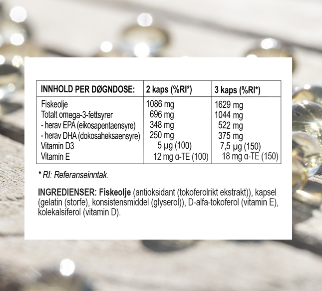 - Omega-3, som er godt for hjerte, hjerne og syn*. I tillegg har vi tilsatt vitamin D som bidrar til immunforsvarets normale funksjon, og vitamin E som bidrar til å beskytte cellene mot oksidativt stress